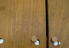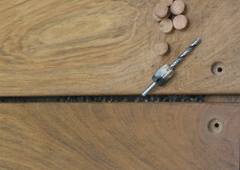 Träpluggarna monteras med vattenbeständig trälim så att åren spolas ihop med brädorna. Pluggen slås in och överskottslimet avlägsnas omedelbart. (en del av pluggen måste sticka upp)