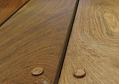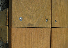Pluggarna är utplattade för att ligga jämn med brädorna. Vi rekommenderar att hela terrassen slipas för att göra den enhetlig i sitt uttryck.